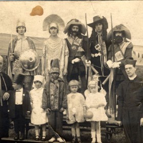 Fancy dress group with clergymen, possibly outside St. Mary’s Church, around 1924. Possibly dressed up for Carnival.