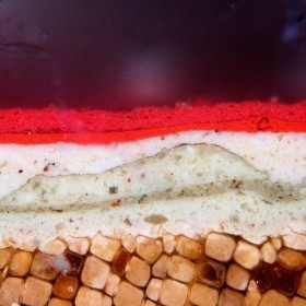Paint sample. Specialists used magnified paint samples like this one to look at the layers of decoration underneath the modern paint.
