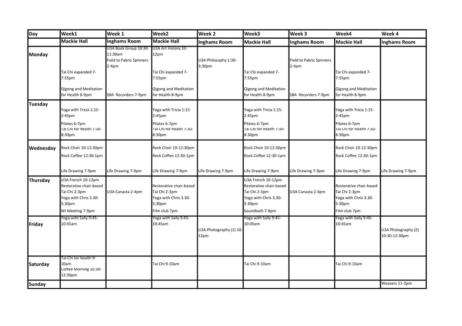 Below displays our regular bookings, however it does not include one off bookings or our events. Please contact us directly to check specific availability.